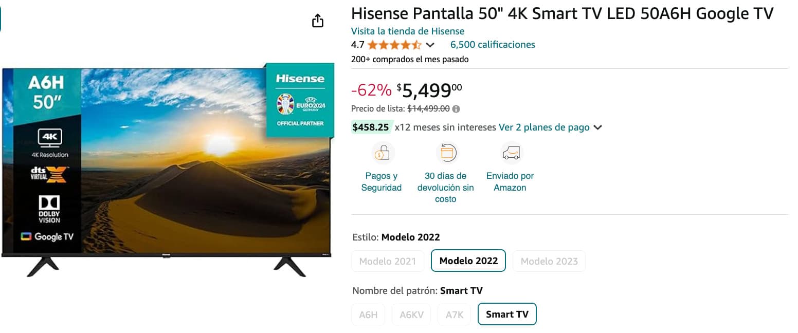 El precio normal de la Pantalla Hisense de 50″ 4K es de 14,499.90 pesos; actualmente tiene un descuento de 62% por lo que su precio final es 5,499 pesos.