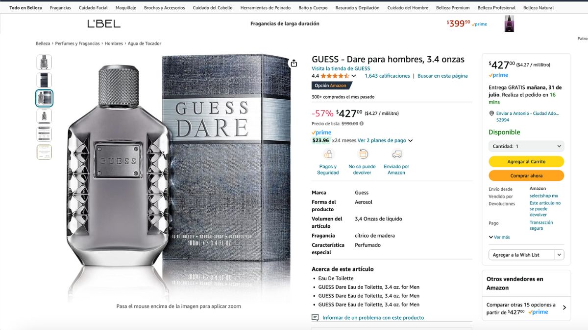 El costo de la Guess Dare para hombre en Amazon es de 990 pero si aplicamos el 57%, su costo quedaría en 427 pesos.