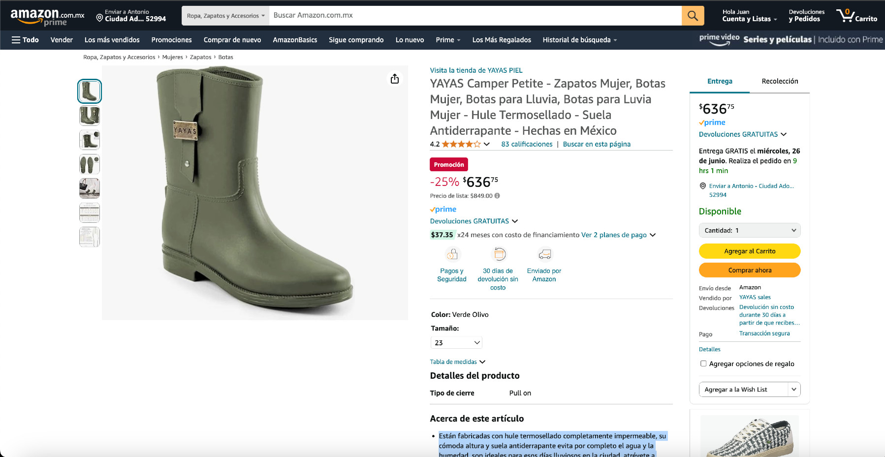 Estas botas de lluvia tienen únicamente los números 23 y 24 y son color verde olivo, además de que precio es de 636 pesos con 75 centavos.