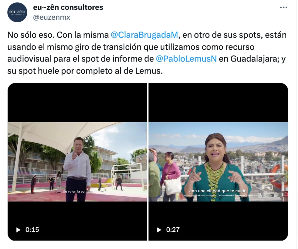 No sólo eso. Con la misma @ClaraBrugadaM, en otro de sus spots, están usando el mismo giro de transición que utilizamos como recurso audiovisual para el spot de informe de @PabloLemusN en Guadalajara; y su spot huele por completo al de Lemus.