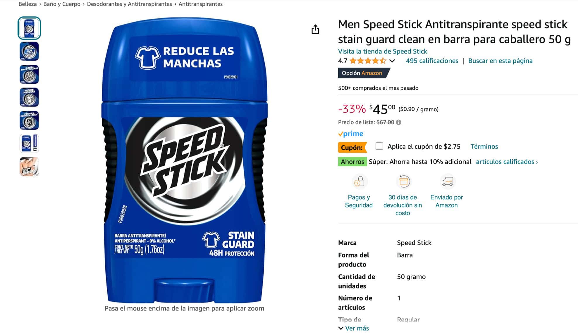 Este desodorante ofrece hasta 48 horas de protección antitranspirante y ayuda a prevenir manchas en la ropa. Es ideal para quienes buscan una protección duradera y efectiva contra el sudor. Actualmente, tiene un 33% de descuento y está calificado con 4.7 estrellas de 5, lo que lo convierte en una excelente opción.