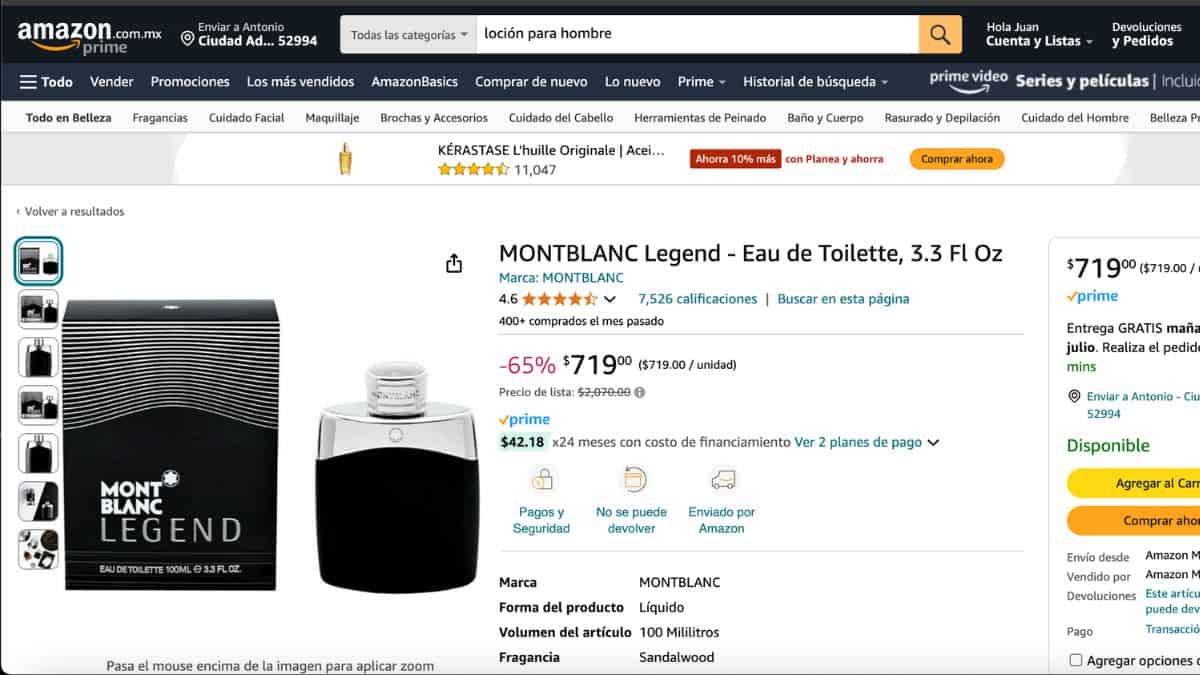 El costo de la fragancia Montblanc Legend para caballero es de 2 mil 070 pero Amazon lo tiene con el 65% de descuento, así que su precio quedaría en 719 pesos.