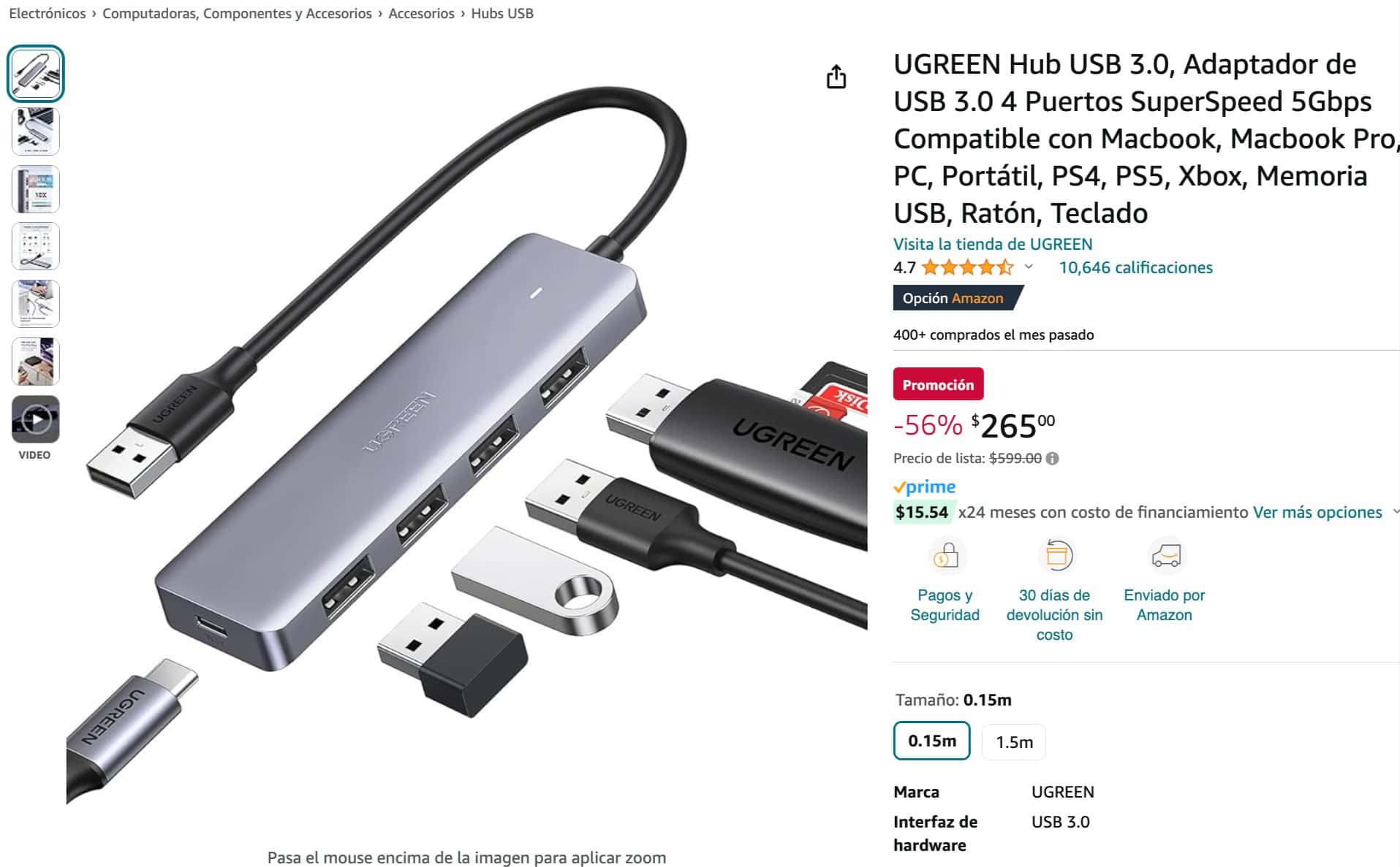 Con una impresionante valoración de 4.7 de 5 estrellas y más de 10,646 calificaciones, el UGREEN Hub USB 3.0 ha ganado la confianza de miles de usuarios. Ofrece una excelente relación calidad-precio con un ahorro del 56% sobre su precio de lista.