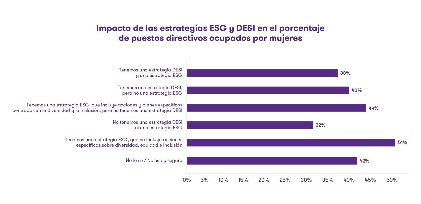 En España, las empresas que cuentan con una estrategia ESG, pero no de diversidad, igualdad y equidad son las que registran mayor porcentaje de mujeres directivas (51%), seguidas por aquellas que complementan su estrategia ESG con algunas medidas de diversidad, igualdad y equidad, pero sin ninguna estrategia concreta (44%). Una tendencia distinta a la registrada a nivel internacional, ya que la mayor presencia de liderazgo femenino se produce en empresas con una estrategia de diversidad, equidad e inclusión, pero sin estrategia ESG (38%), seguida por las empresas que cuentan con ambas (36%). Estas cifras indican que, en nuestro país, aún queda un gran trabajo por hacer en cuanto al desarrollo e implantación de estrategias de diversidad, equidad e inclusión, un aspecto fundamental para evitar que estas medidas se diluyan en los planes ESG.