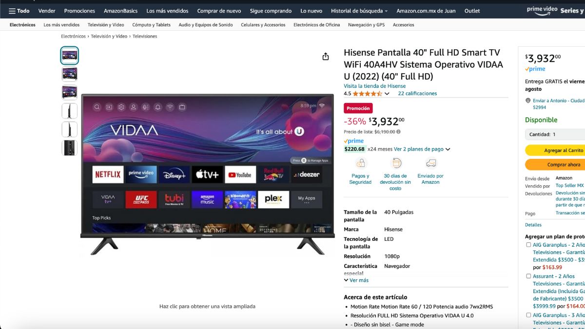 Precio pantalla Hisense de 40 pulgadas en Amazon