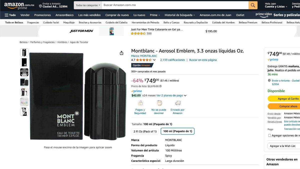 La fragancias Mont Blanc Emblem tiene 4.7 estrellas de 5, además es una Opción Amazon, eso quiere decior buena calificación y buen precio.