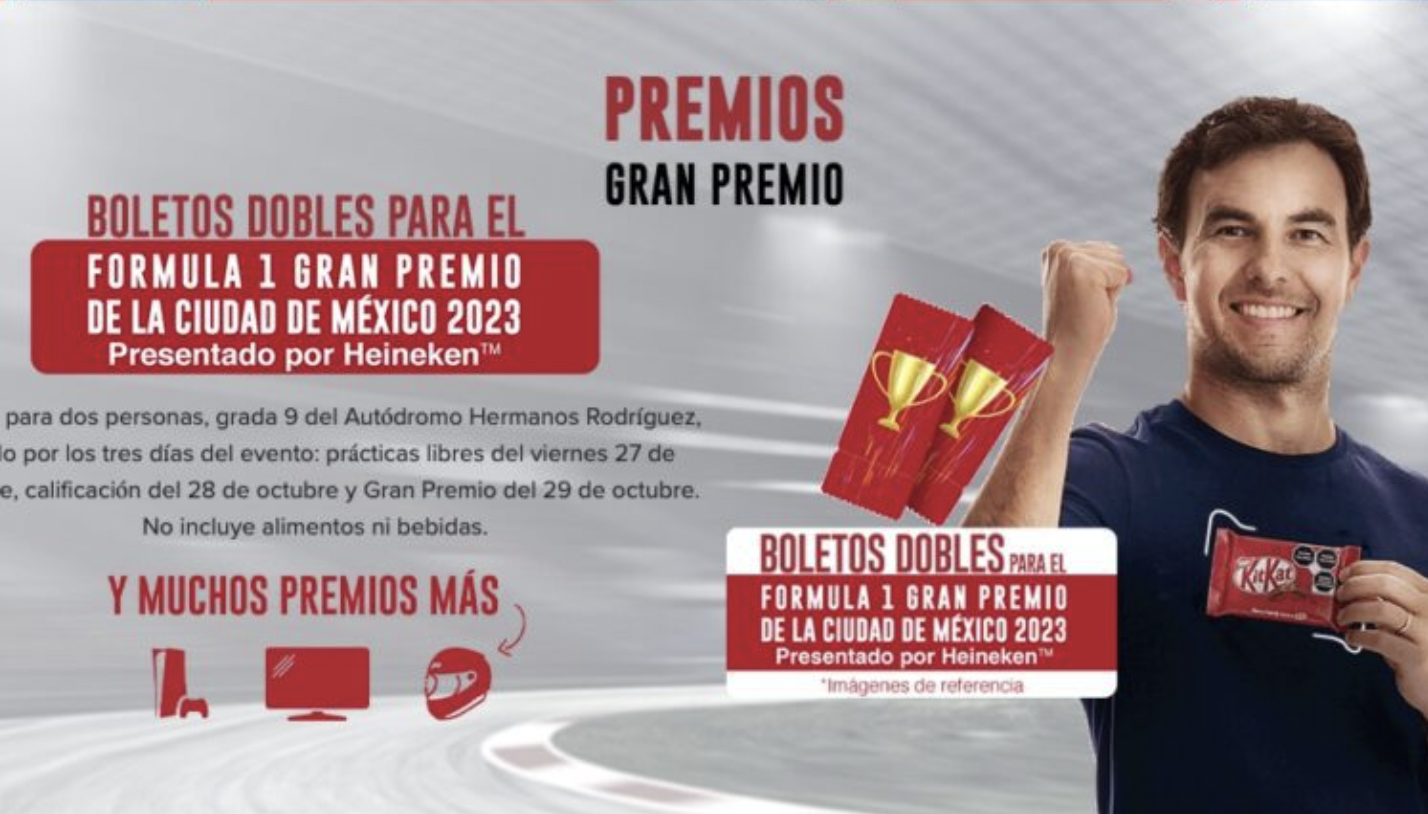 Por otro lado, Kit Kat te invita al Gran Premio de México, pues a través de su publicidad que están haciendo junto “Checo” Pérez la marca sorprende a cada uno de los amantes de la Fórmula 1 y del piloto mexicano quien le esta dando mucha publicidad y difusión al producto con su imagen.