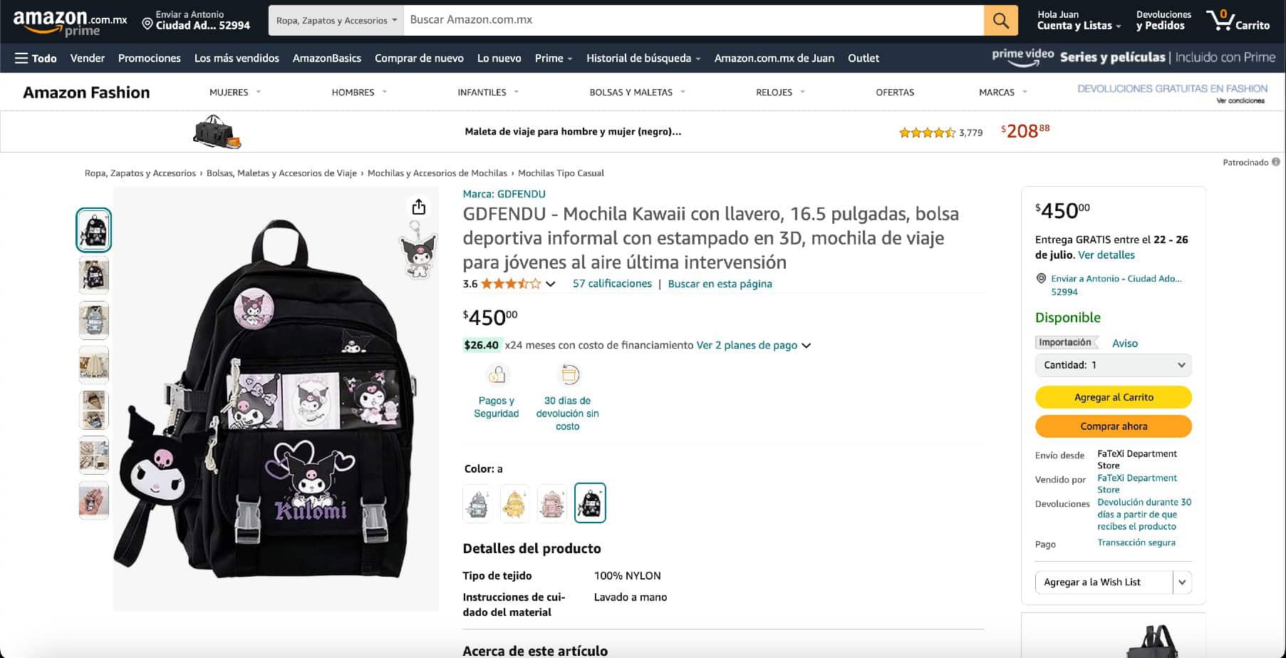 La primera opción que está ofreciendo Amazon es la mochila Kawaii con llavero.