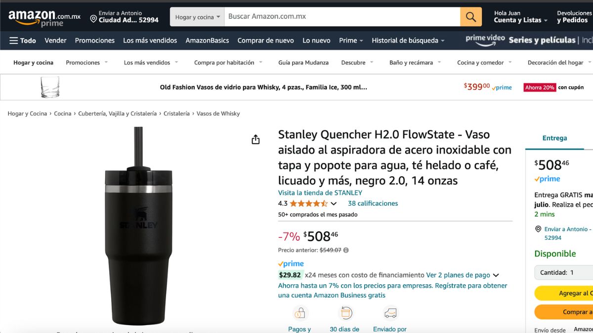 El costo del vaso Stanley negro es de 549 pesos con 07 centavos, pero con el descuento del 7%, su costo quedaría en 508 pesos con 46 centavos.