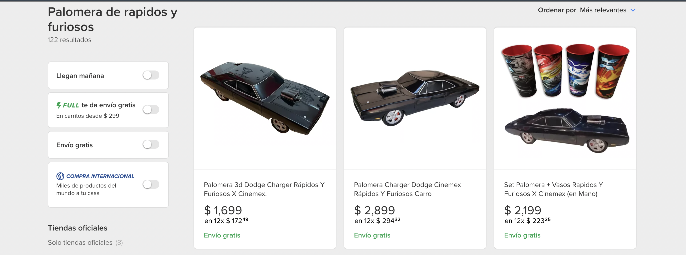 Tan solo el puro carro sale en la reventa por Mercado Libre en mil 699 pesos, mientras que otra imagen muestra el automóvil de Dominic Toretto con cuatro vasos en 2 mil 199 en donde la plataforma te da la opción de liquidar tus artículos a 12 meses sin intereses.