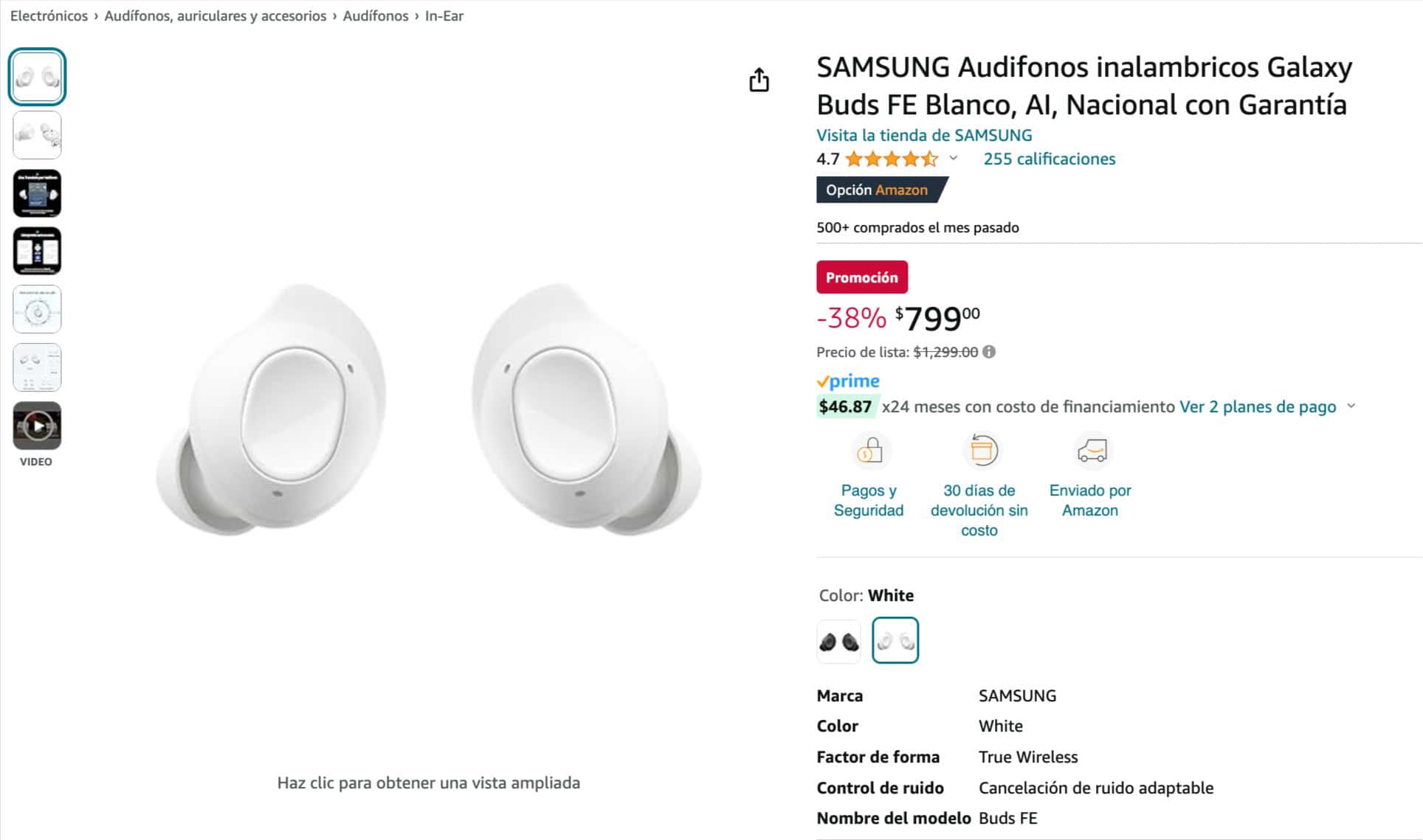 Los Galaxy Buds FE están disponibles por sólo 799 pesos en Amazon, con un descuento del 38% sobre su precio regular de 1,299 pesos. Además, disfruta de envío gratuito y la tranquilidad de una garantía nacional de Samsung.
