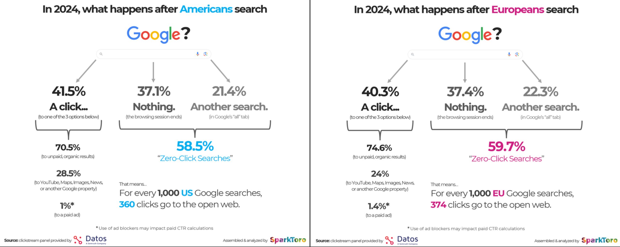 1. Búsquedas de cero clics en EE.UU. y la UE: 58.5% en Estados Unidos y 59.7% en la Unión Europea de las búsquedas no generan ningún clic.