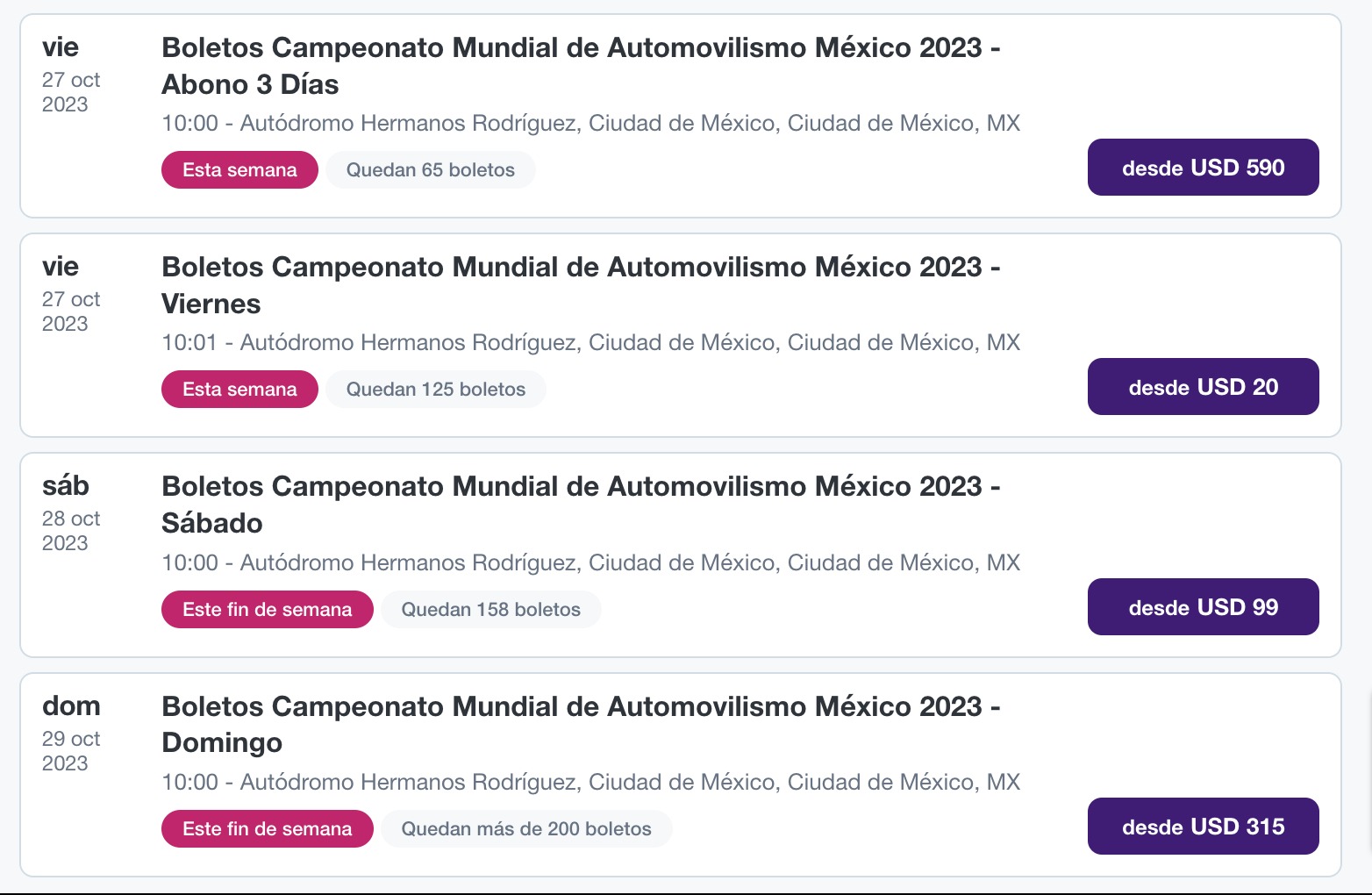 - Domingo, 29 de octubre, 2023: Boletos para el día domingo, que ofrecen la oportunidad de presenciar la emocionante carrera del Gran Premio de México 2023. Quedan más de 200 boletos disponibles, con precios a partir de USD 315.