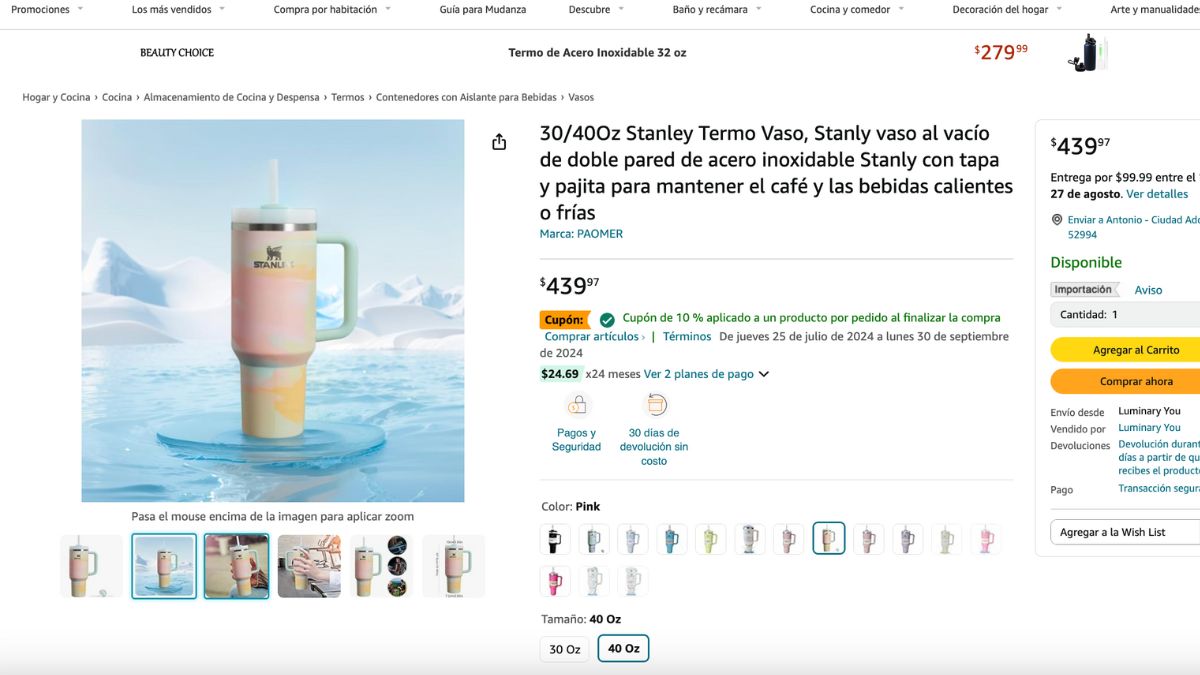 El increíble precio del vaso Stanley en Amazon lo puedes obtener a través de un cupón, el cual aplica el 10% al finalizar la compra.